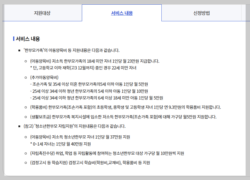 - 지원기간 : 자녀가 18세 미만 또는 고등학교 졸업(고3 12월 말까지)