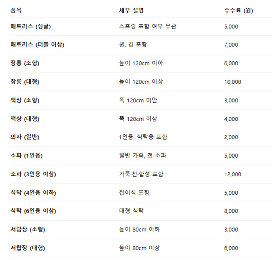 냉장고나 세탁기처럼 무상수거 대상이 아닌 물건들, 예를 들면 옷장, 침대, 매트리스, 책상, 의자, 장롱 등 가구류는 대부분 지자체의 유료 대형폐기물 배출 서비스를 이용해야 합니다.