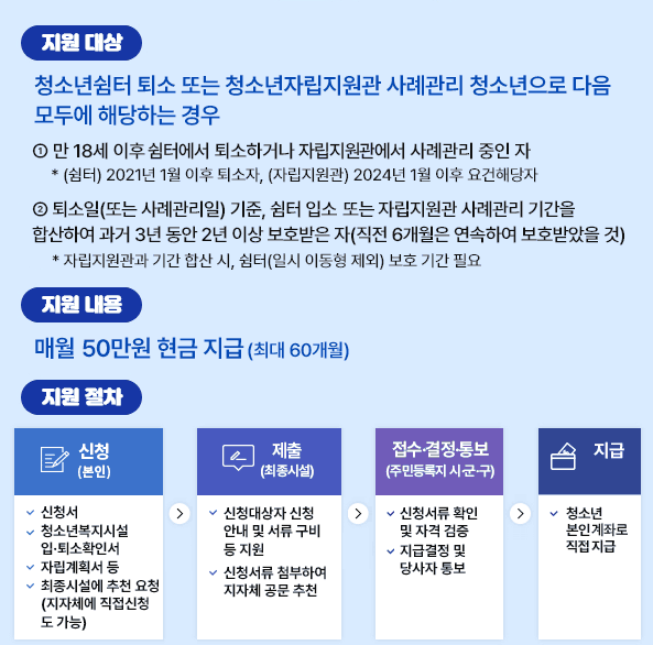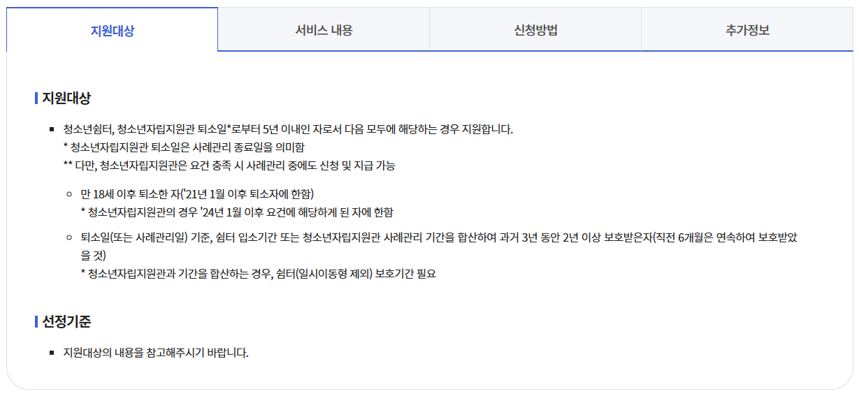 • 2021년 1월 이후 퇴소자만 해당 (청소년자립지원관은 2024년 1월 이후 요건 충족자 포함)