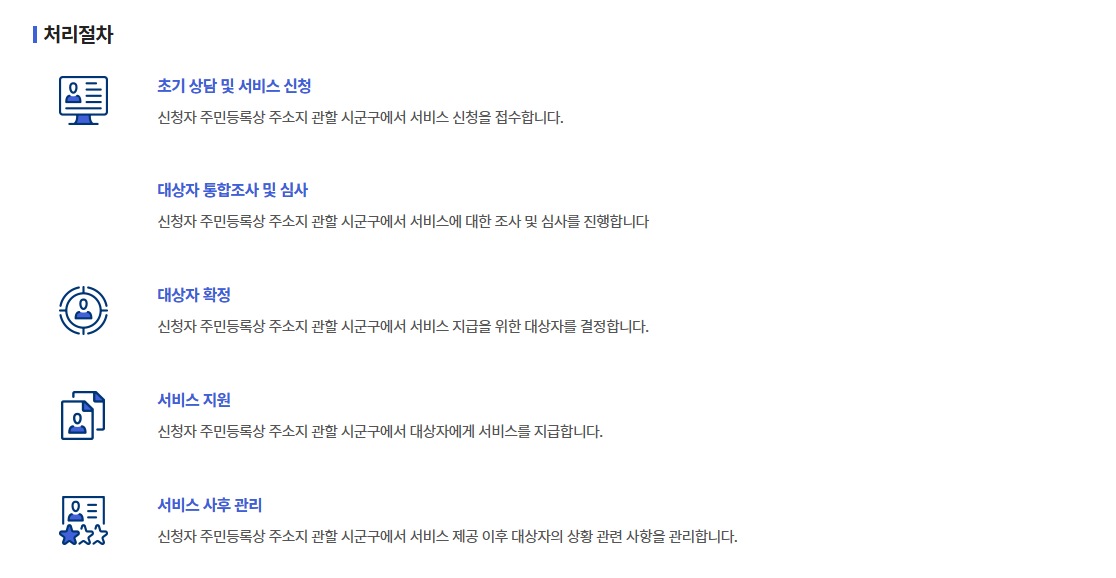 • 시설과의 연락이 어렵거나, 직접 신청이 불가한 경우에는 신청자가 주소지 관할 주민센터를 통해 직접 신청할 수도 있습니다. 이 경우에는 필요 서류를 모두 갖추어 방문 신청해야 합니다