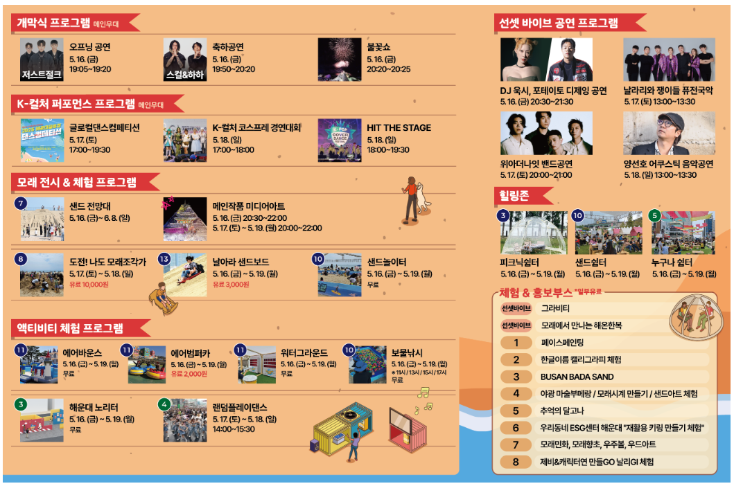 가족, 연인, 친구들과 함께 잊지 못할 특별한 추억을 만들 수 있는 이 축제. 이번 기회에 모래 위에서 펼쳐지는 K-컬처의 생생한 순간을 직접 경험해보시길 바랍니다.