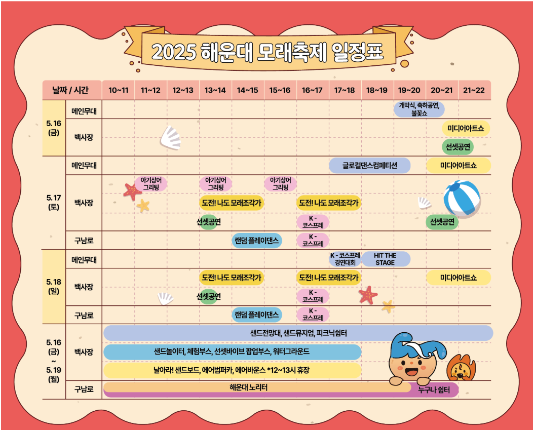 2025년 해운대 모래축제는 5월 16일(금)부터 5월 19일(월)까지 총 4일간 해운대해수욕장 및 구남로 일대에서 열립니다.