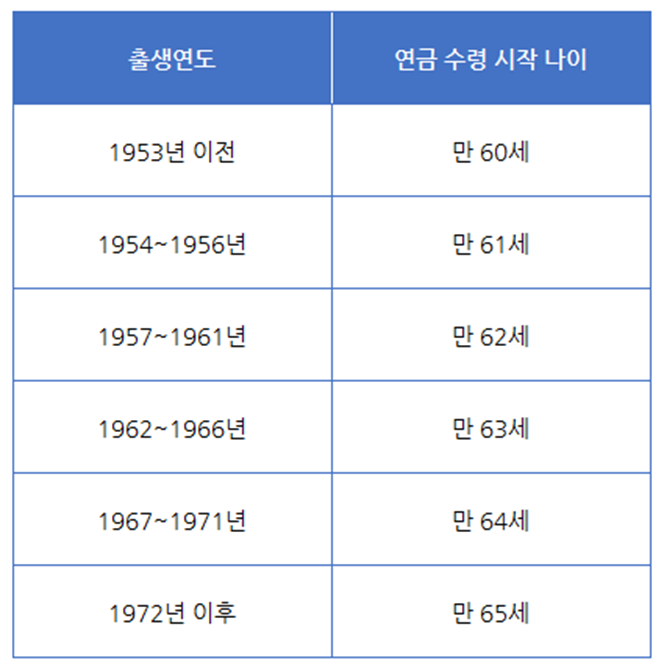 즉, 1972년생 이후부터는 만 65세가 되어야 연금을 받을 수 있는 것입니다.