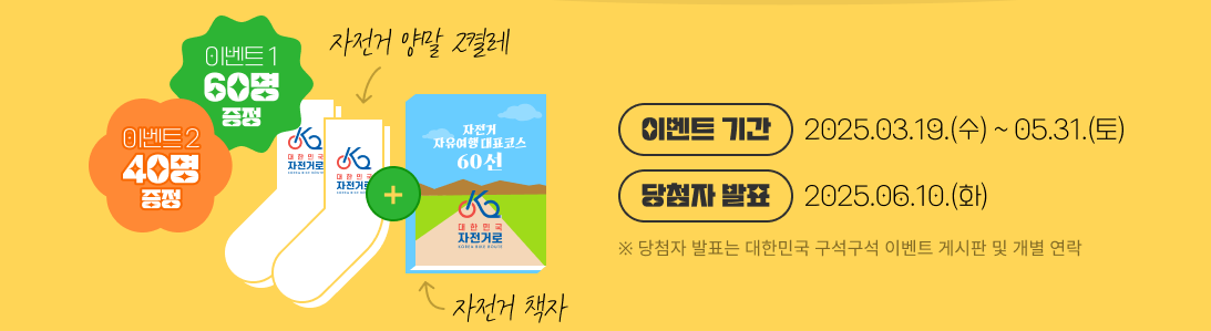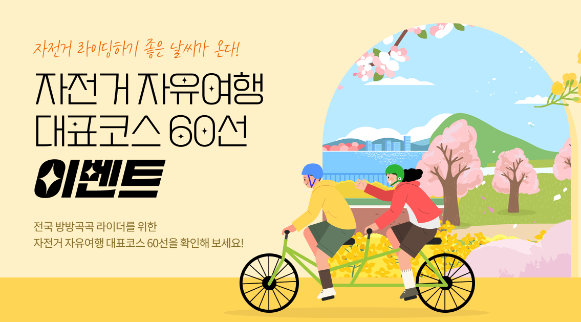 <div> 자전거 자유여행 대표코스 60선 이벤트 / 이벤트 1. 자전거 자유여행 대표코스 60선 선호도 조사 / 이벤트2. 자전거 라이딩 추천 스팟 제보 이벤트 / 이벤트 참여기간 : 2025. 3. 19.(수) ~ 5. 31.(토)