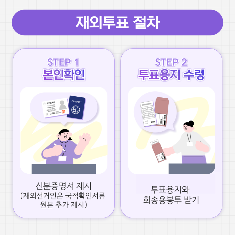 - 여권, 주민등록증 등 신분증을 반드시 지참해야 하며, 미지참 시 투표 불가입니다.