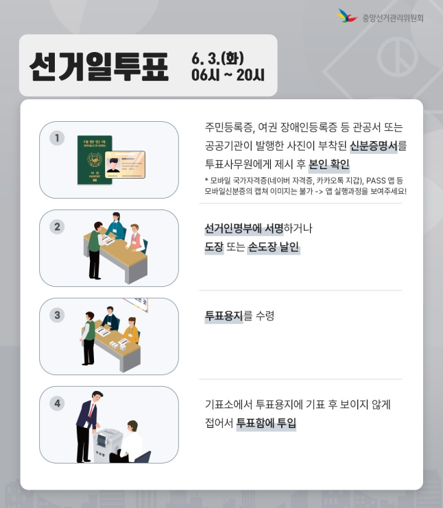 - 모든 유형의 투표에서 가장 중요한 것은 신분증을 지참하는 것이며, 모바일 신분증의 경우 반드시 앱을 직접 실행해 제시해야 합니다.