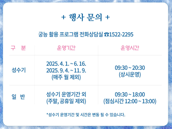 - 문의처 : 궁능 활용 프로그램 콜센터 ☎1522-2295 / 궁중문화축전팀 ☎02-3210-4635
