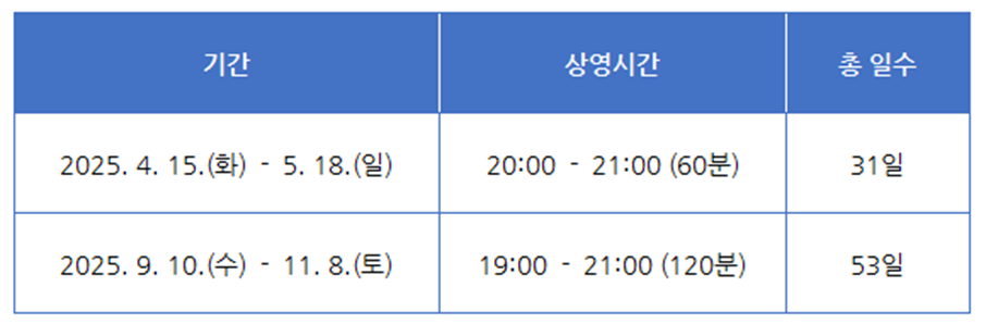 - 관람소요시간 : 전체 상영 기준 약 60 - 120분
