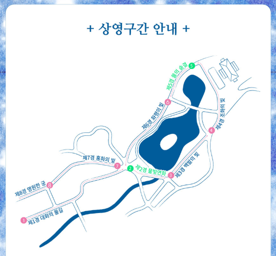 2025 창경궁 물빛연화는 총 8개의 관람 포인트(경)를 중심으로 구성되어 있으며, 각 공간은 한자 ‘화’의 의미를 예술적으로 해석해 조명·음향·영상미디어를 통해 표현합니다.
