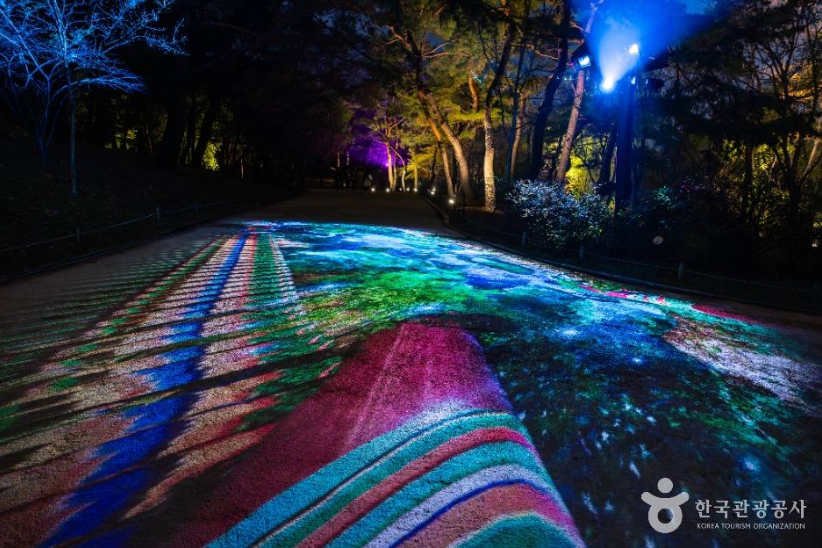 해가 지고 어둠이 깔린 궁궐 안, 고요한 연못과 고목들 위로 화려한 빛과 음악이 어우러지며 만들어내는 환상적인 야경은 단순한 조명쇼가 아닌, 고궁과 자연, 예술의 절묘한 조화를 보여줍니다.