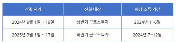 근로소득만 있는 자는 반기신청과 정기신청을 선택하여 신청할 수 있고,사업 또는 종교인 소득이 있는 자는 정기신청을 하셔야합니다.