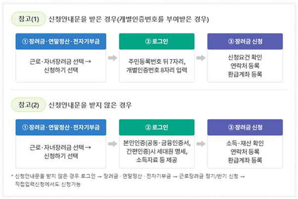 - 장려금 → 신청하기 → 근로·자녀장려금 선택