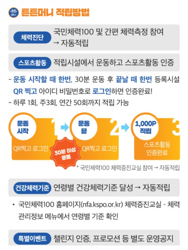 국민체력100 사업의 일환으로, 국민이 체력진단을 받고 일정 기준 이상의 체육활동을 하면 포인트를 지급받을 수 있습니다.
