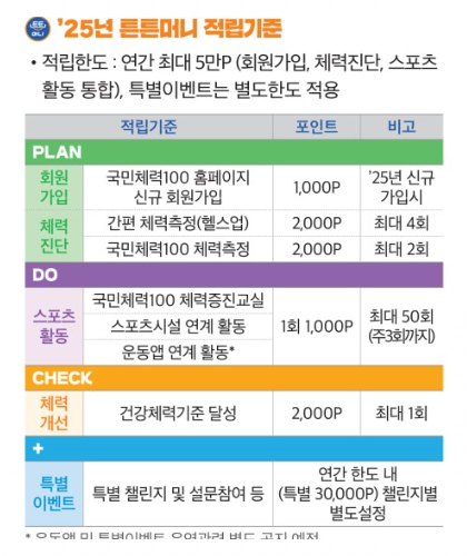 - 국민체력100 누리집 내 특별 이벤트·설문 참여 등으로 추가 적립 가능