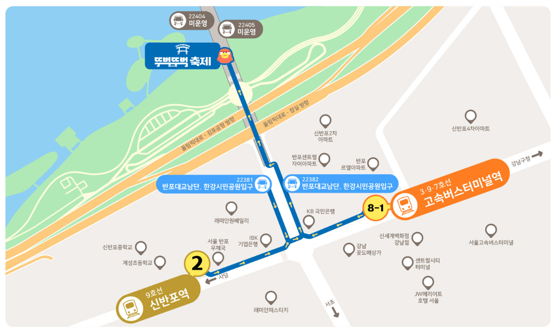 - 반포한강공원 주차장(유료) : 주말 혼잡하므로 오전 11시 이전 도착 권장