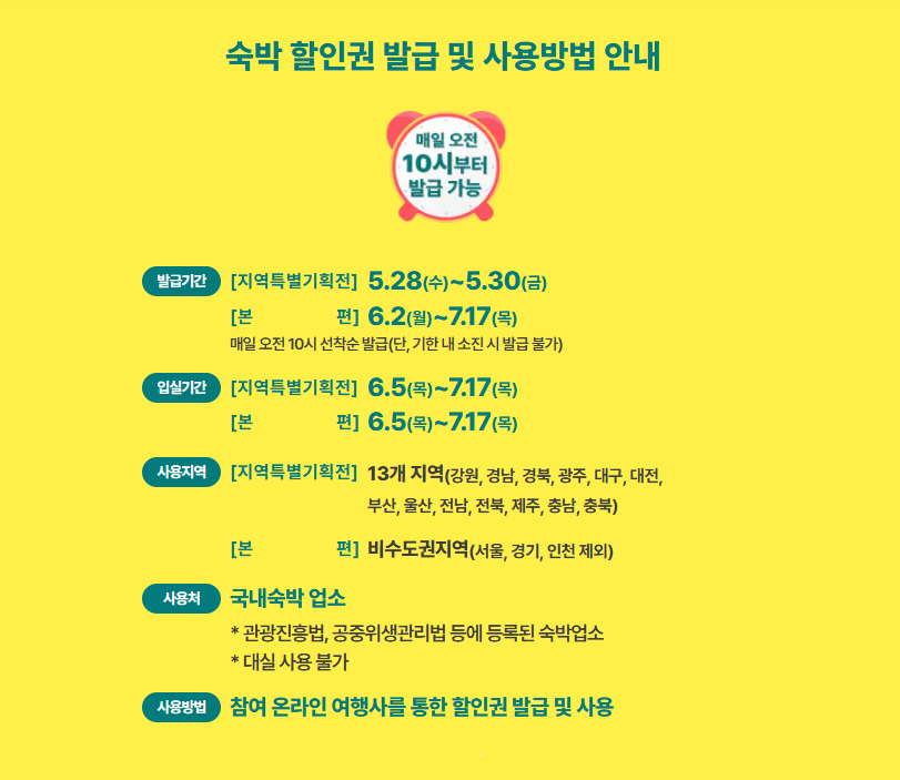 이번 숙박세일페스타는 총 세 가지 유형의 할인권으로 구성되어 있으며, 발급 기간과 사용 조건에 따라 혜택이 다르게 적용됩니다.