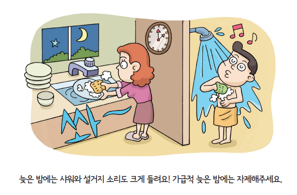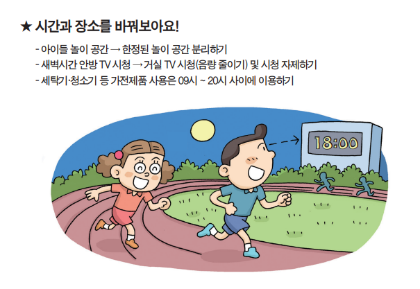 소음이 큰 활동은 낮 시간에 집중 - 청소기 사용, 운동 등은 오전 9시 - 저녁 6시 사이로 조정하는 것이 좋습니다.