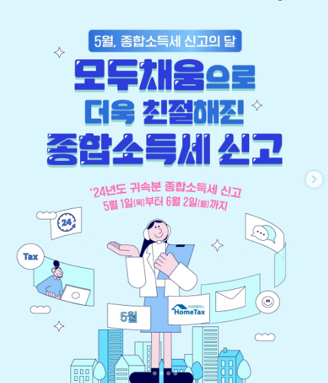 종합소득세는 매년 5월 1일부터 5월 31일까지 신고 및 납부해야 하며, 국세청 홈택스를 통해 비대면으로도 편리하게 신고하실 수 있습니다.