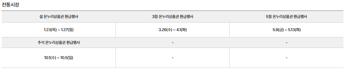 • 환급 방식 : 전통시장에서 일정 금액 이상 결제 시, 온누리상품권으로 최대 2만 원까지 환급