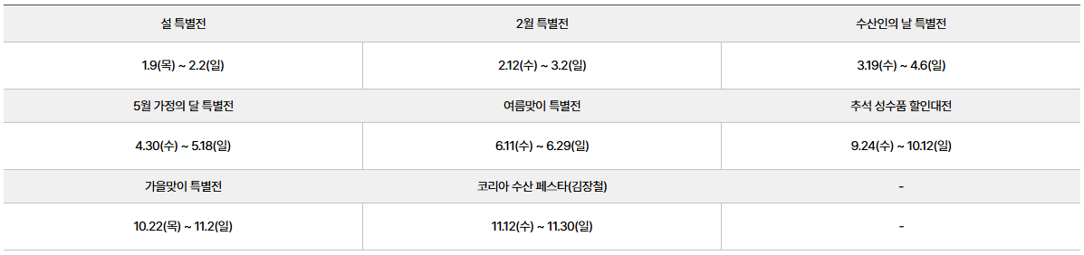• 연중 상시 캠페인 : 매달 다른 수산물과 이벤트 중심으로 판촉전이 진행