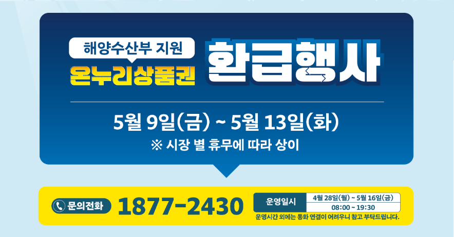 전국 전통시장(수산시장 포함)에서 수산대전 할인행사와 온누리 환급행사가 동시에 적용됩니다.