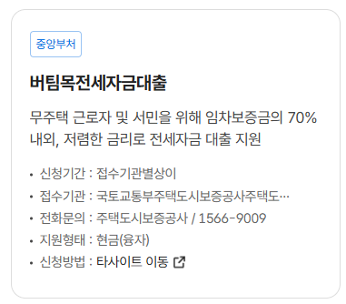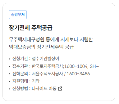 • 청년 월세지원 : 만 19 - 34세 무주택 청년 대상, 월 최대 20만 원 지원 (최대 12개월)