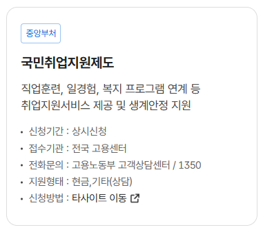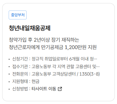 - 청년취업 지원금 : 만 19세 - 34세 구직자 대상 월 최대 50만 원 6개월간 지원