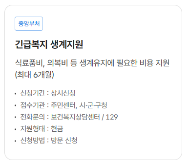 • 긴급복지지원제도 : 생계형 위기 상황에 처한 국민에게 임시 지원