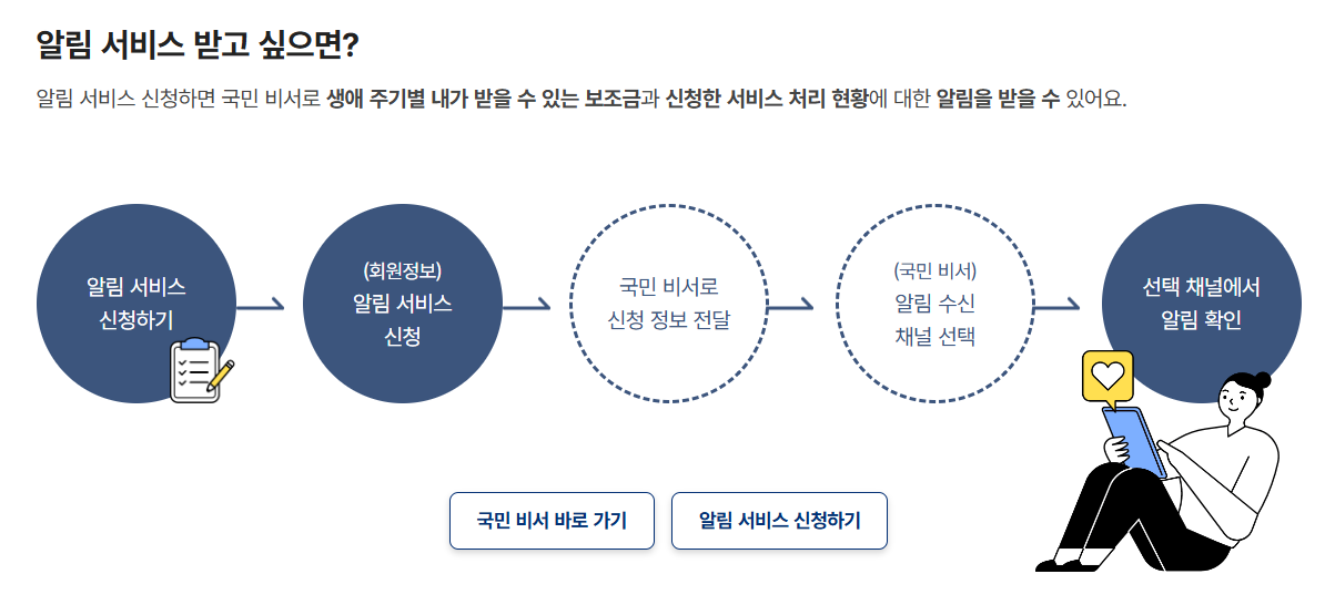 보조금24는 신청 가능한 시기를 놓치지 않도록 알림 기능도 제공하고 있어, 나와 가족에게 필요한 혜택을 놓치지 않고 챙길 수 있습니다.